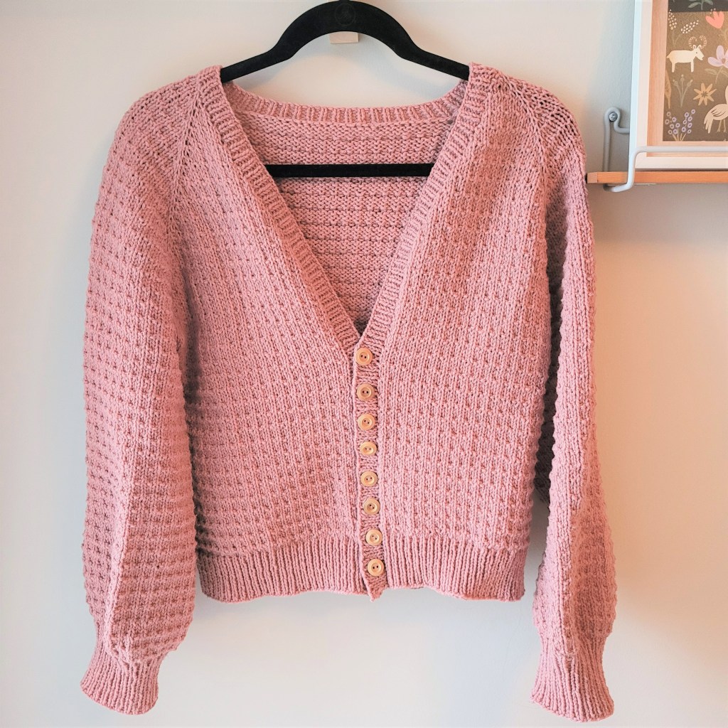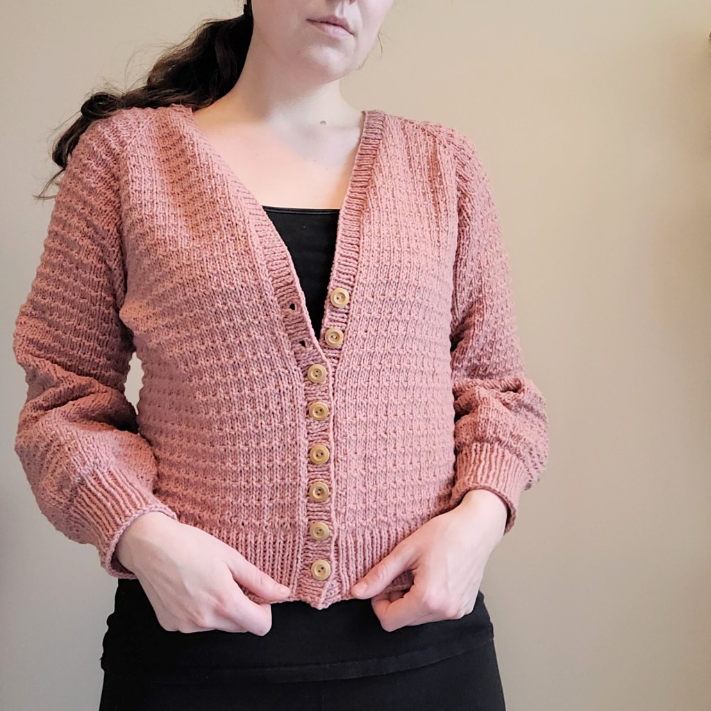I definitely added WAY more buttons than necessary, but I’m going to call it a design choice. I almost never close my cardigans anyways! Fit-wise, I like how it’s not oversized and is a bit cropped. I might size up to a large for future versions and lengthen both the body and arms (I’m 5’9 for reference), but it’s nice to have different options for my wardrobe. Overall, I really recommend this pattern by Knit Purl Girl. It was a fun one!