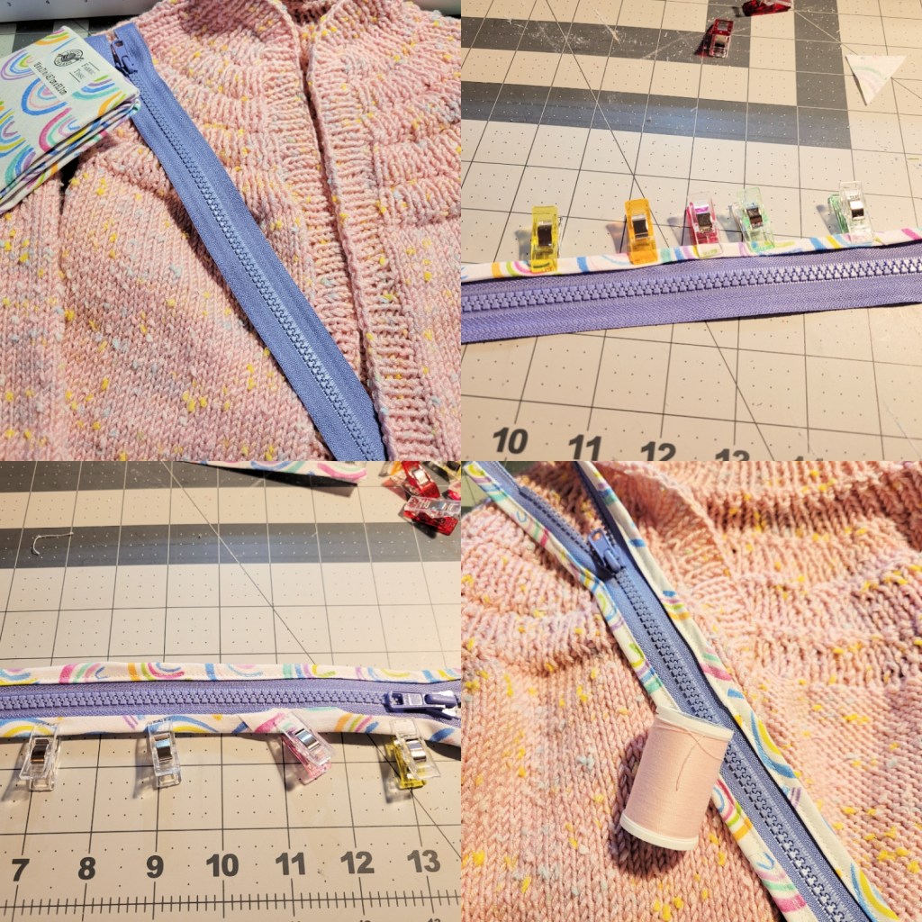 I finished the inside of the zipper with my typical bias binding method. I love using bias binding because it not only finishes the edge, but also offers a discreet way to attach the zipper to the fabric. To baste the zipper to the cardigan, I hide the stitches by running the hand stitching underneath the “lip” created by the machine stitching. Then I secure the bias tape the same way you would a quilt binding or hem. Here is a little visual of the process and materials (excuse the crazy lighting from my sewing table).