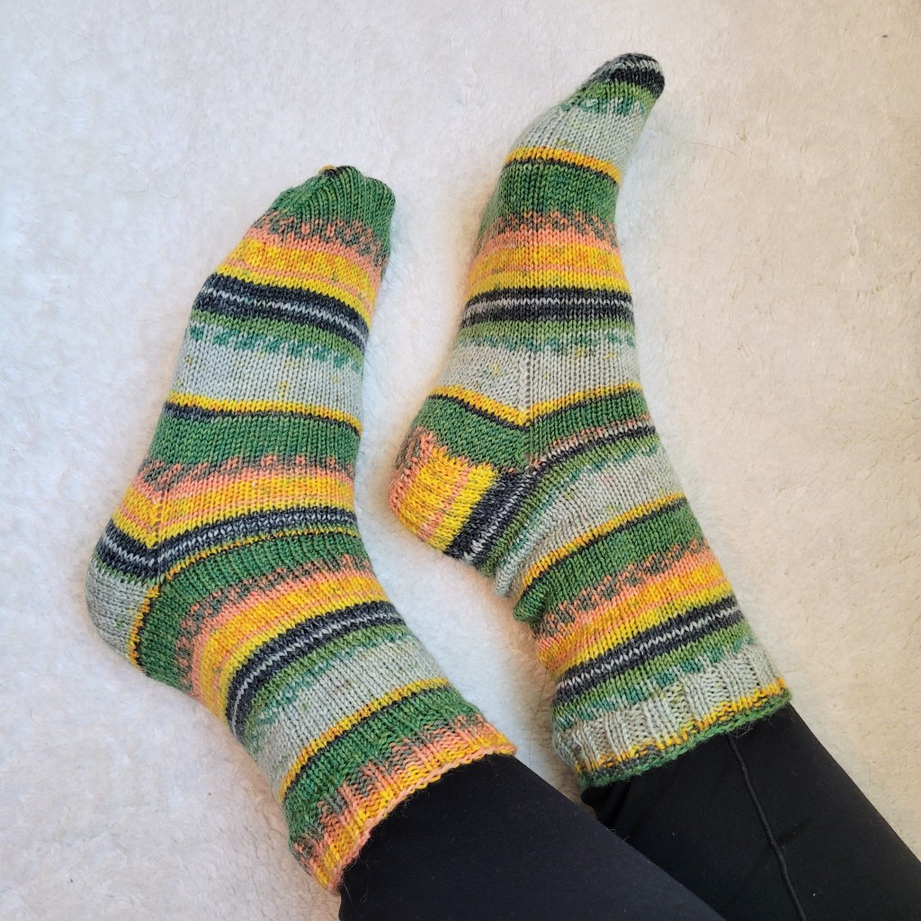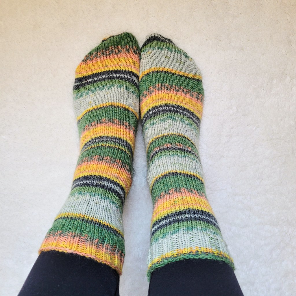 I still can’t believe I made a whole pair of socks on vacation, especially since I haven’t knit a pair that fast since. This pair was made in Regenwald 15 Opal in “Rummel im Dschungel” (I think – it’s difficult to work out the German packaging) on size 4 circular needles, which is much too big a gauge in hindsight. I purchased this yarn quite a while ago, so I don’t have a link, but Opal sock yarn is available at many boutique retailers.