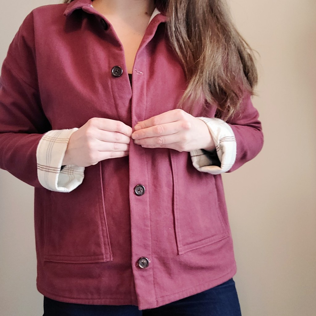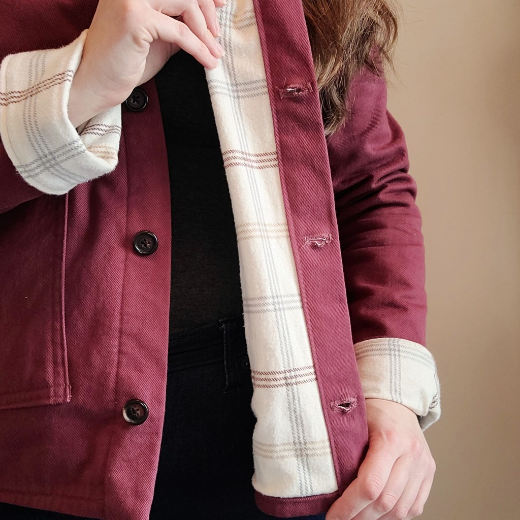 I lined the jacket with a flannel fabric, which I purchased at Joann in the summer of 2022 (what a great time to buy flannel, eh?). As you might have assessed from that last sentence, I’m Canadian, so a trip to Joann is a rare treat. The fabric isn’t anything to write home about, but it’s a cozy addition to this jacket. I was actually able to wear it well into November.