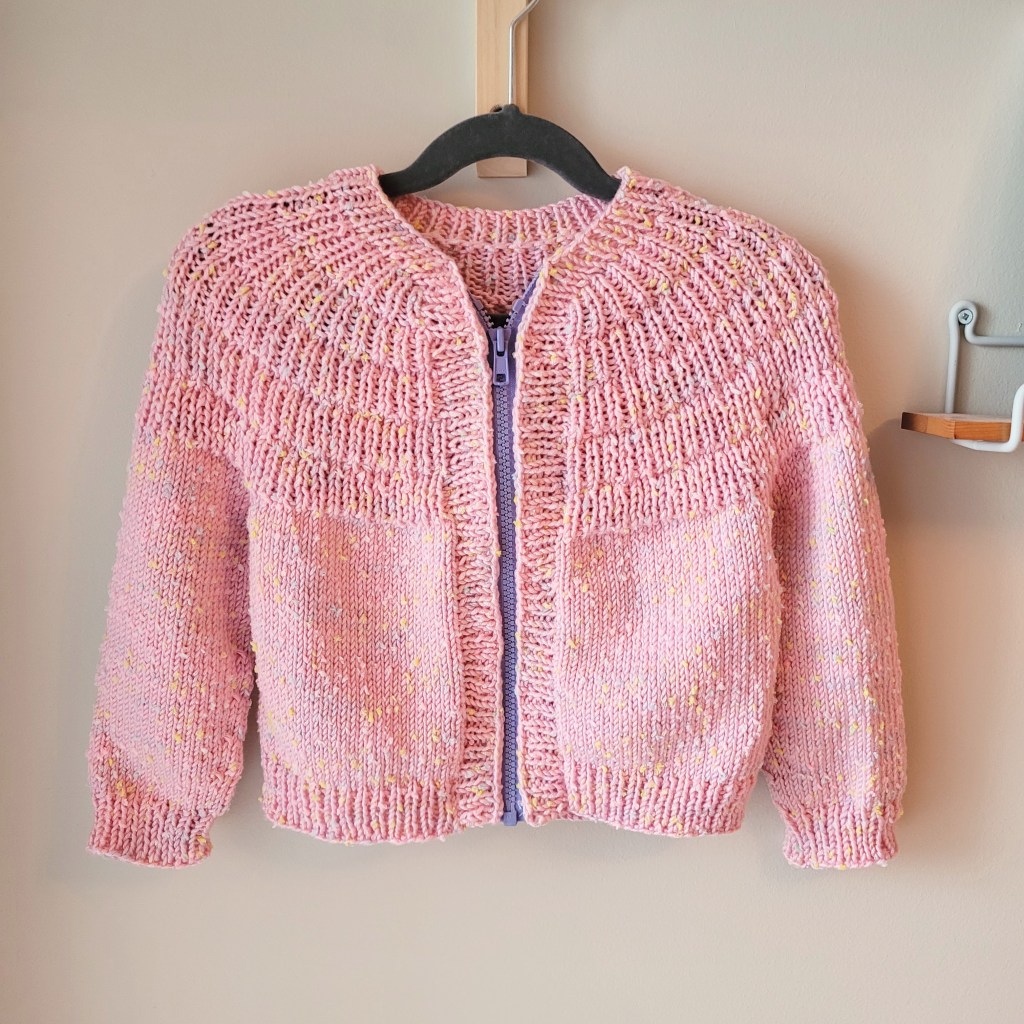 I’ve already created a full blog post on this one (you can check that out here), so I’ll keep it short and sweet. This was such a fun make. As the dates will reveal, once I cast on, I couldn’t wait to cast off. This was my second time inserting a zipper in a cardigan for my two-year-old daughter, and now it’s the only way that I’ll finish her cardigans.