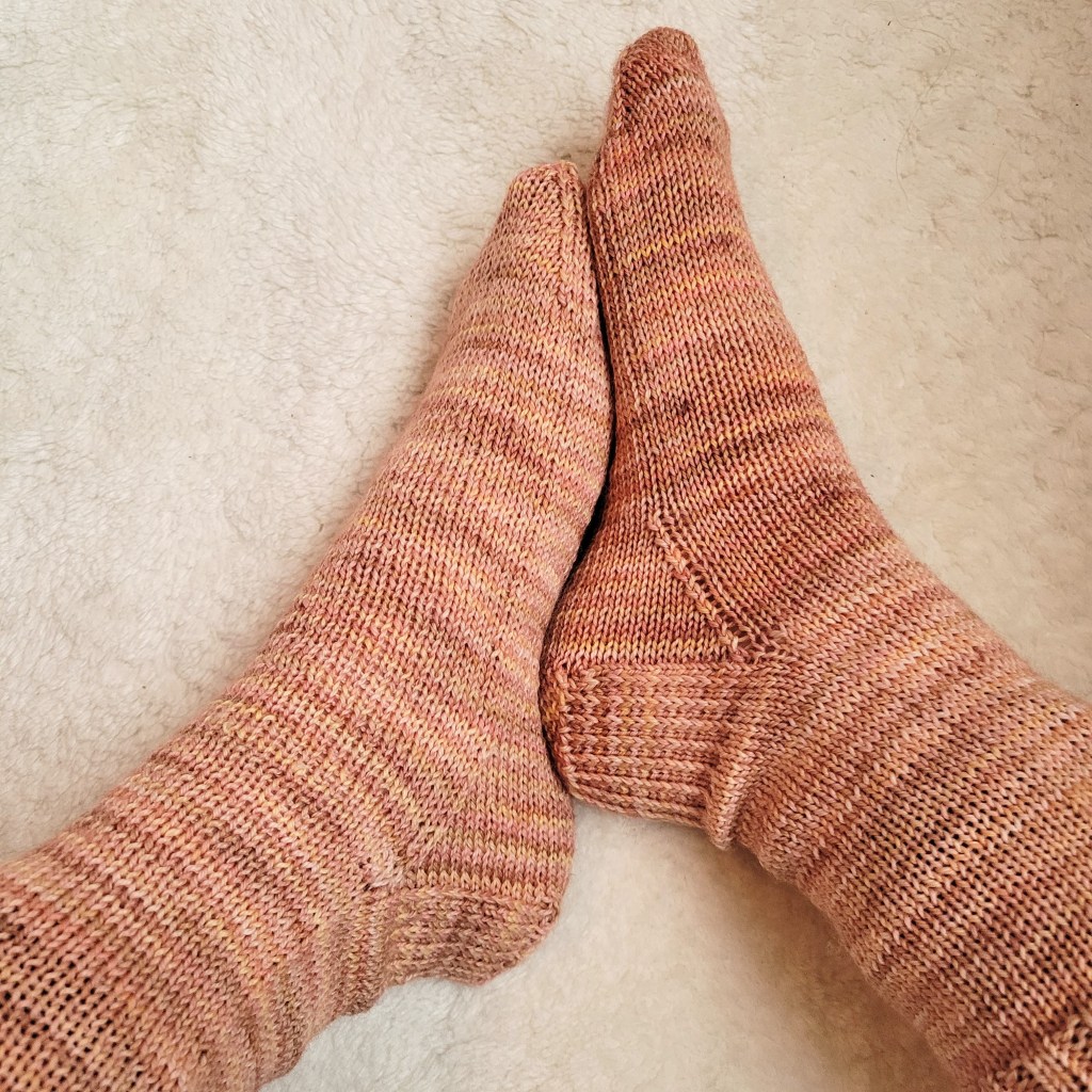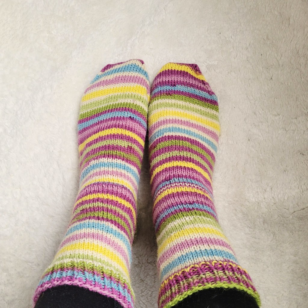 I’m not sure if you can tell, but these socks are at least 10 rows too long and two rows too wide. I could have solved this by sticking to the same measurements/row count as my go-to sock pattern (see above), but I was trying something new and wanted to get it right. I even used a sock ruler for the first time, which might have contributed to the problem. I did LOVE the German short row heel construction and will be using it going forward. I also quite enjoyed the Kroy sock yarn I used for this test run. It’s very affordable and feels super durable