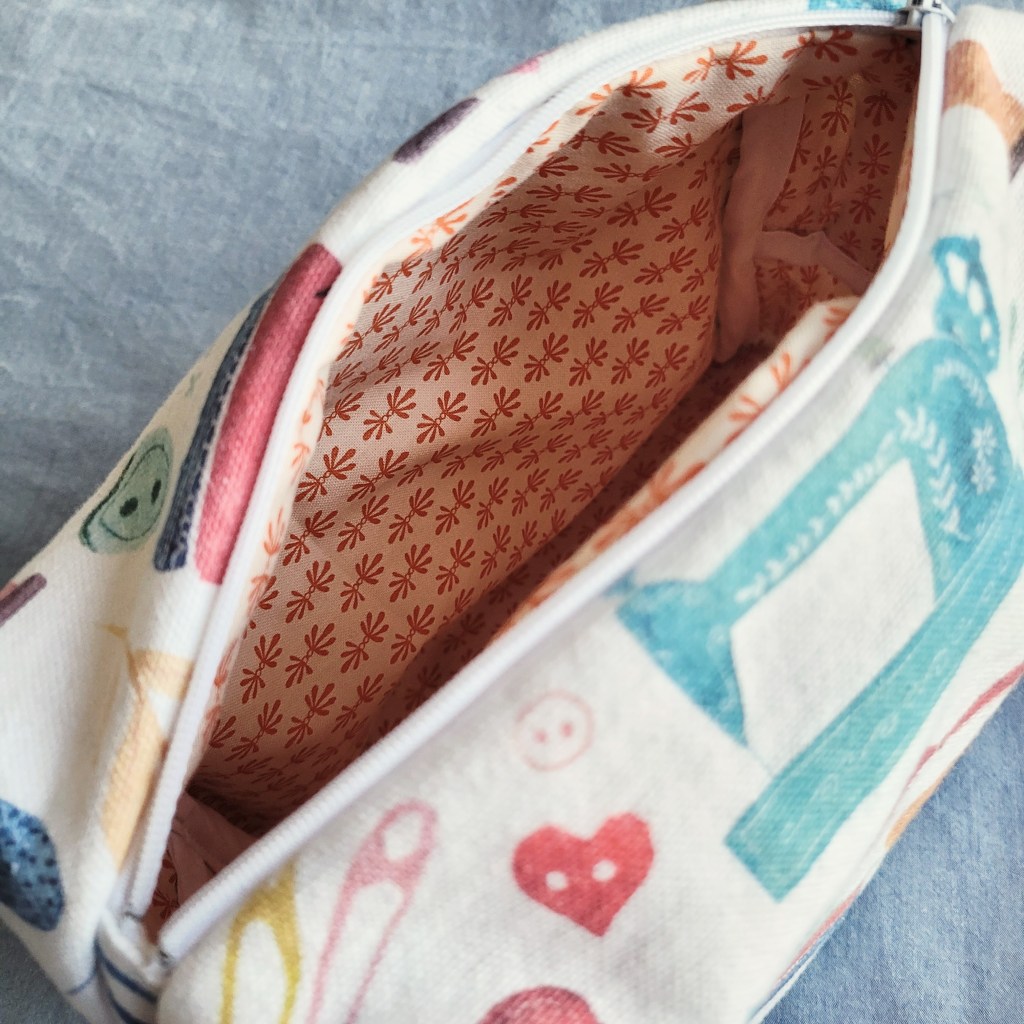 Did I need a new project bag? Absolutely not, but I made one anyway. I specifically wanted a smallish bag that I could use for small knitting projects – one that fit in my purse – and this boxy pouch fit the bill. I’ve actually sewn quite a few of these, so perhaps I’ll make a dedicated blog post at some point. I didn’t have a long zipper to insert in this one, so I created long tabs to go on either side of a 9″. It created a smaller opening that actually works well for sock knitting (especially if the yarn wants to move around). It’s made of a fun sewing-themed cotton canvas, lined with a bright fat quarter, and interlined with cotton quilting batting. This is my third Kandou pattern and they are excellent!