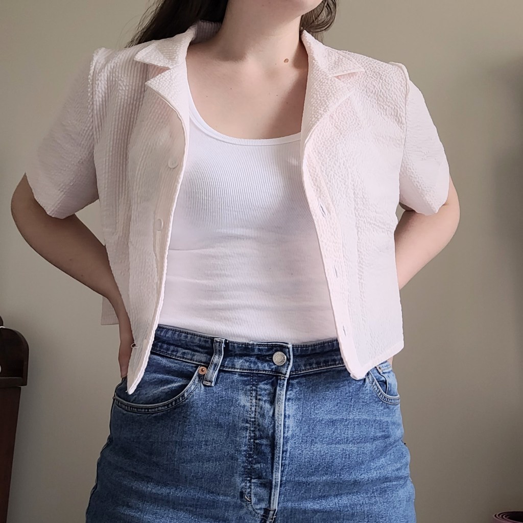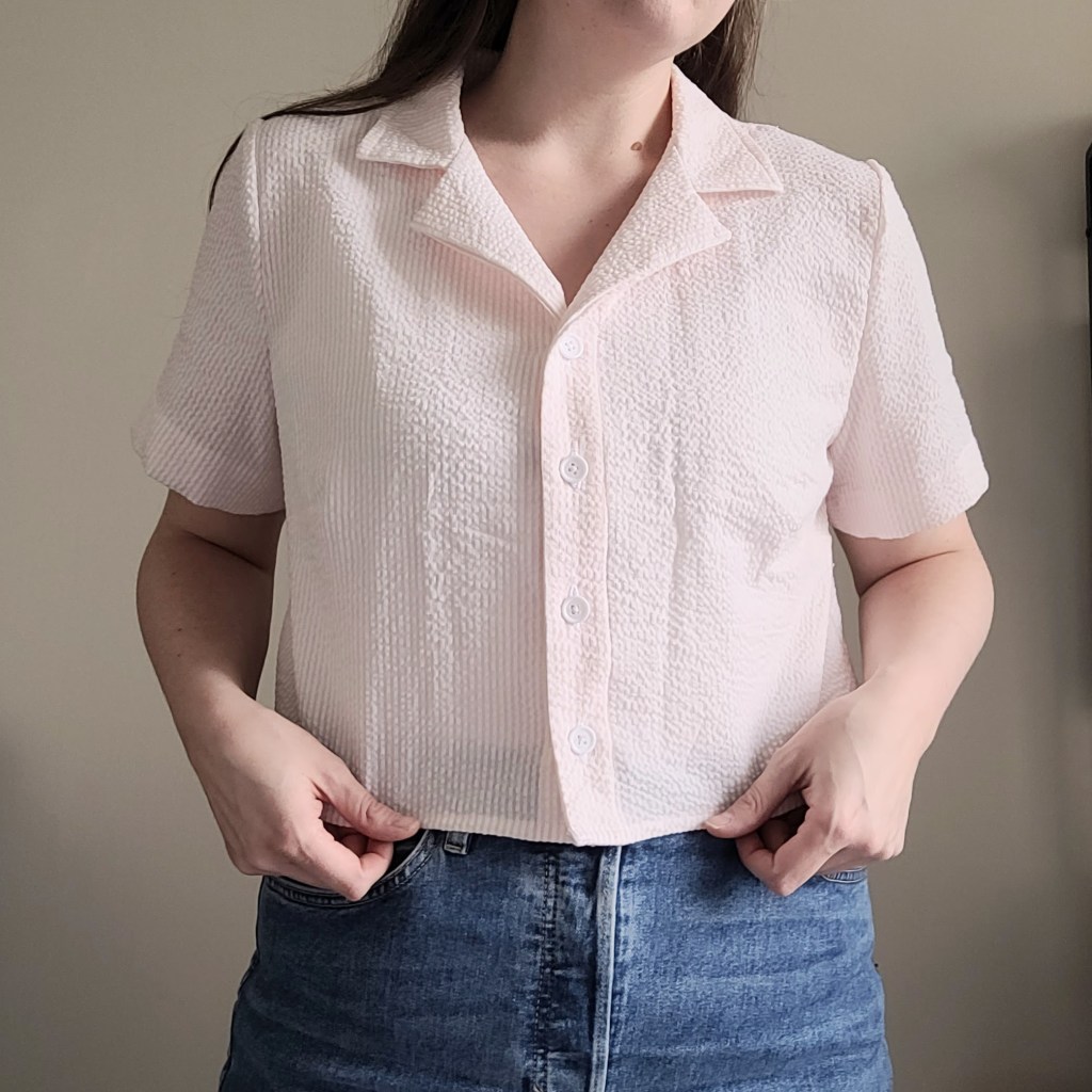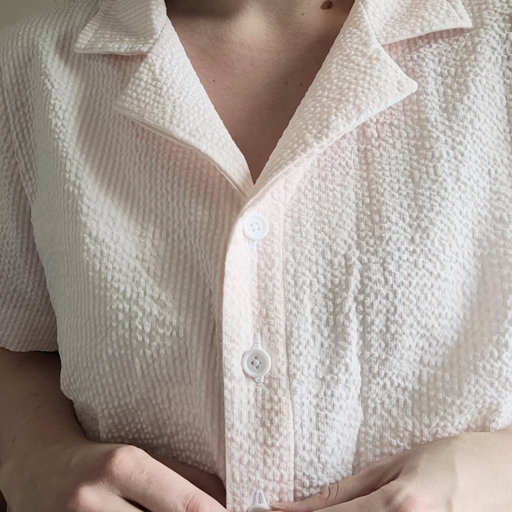 This was a wearable toile, and I’ll definitely still wear it, so I’m not completely heartbroken. I made it from a very cheap seersucker fabric that I purchased in the U.S. a few years ago (pre-pandemic). It’s still 100% cotton and should wear well. I absolutely love sewing with seersucker. It doesn’t stretch out like double gauze and is still light and airy.
