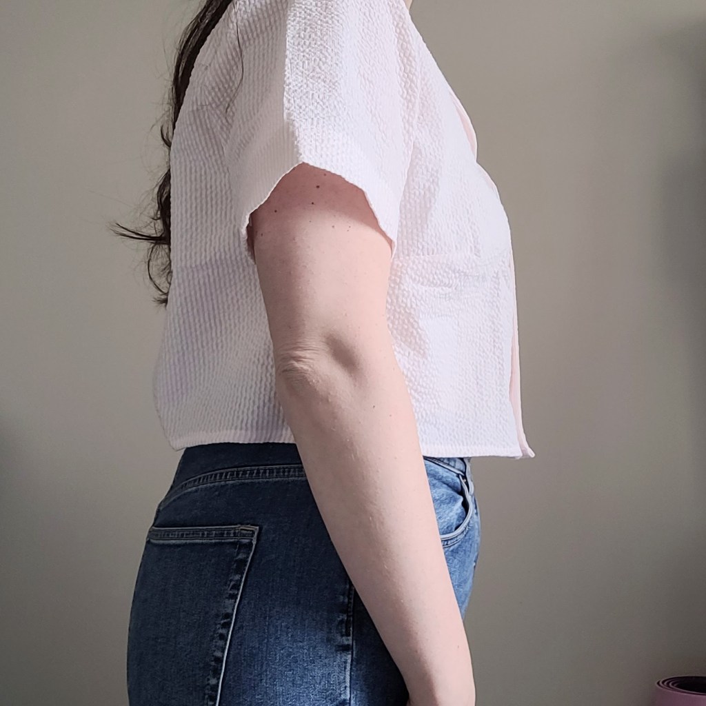 When I cut out this pattern, I had planned to make View A (which features a tie front). I added 2” of length to accommodate my height of 5’9, but I really didn’t need to. The tie sat too low on my hips and looked a bit awkward. This is the second time I’ve lengthened a top pattern that didn’t need it, so I definitely have to reconsider that in the future! To salvage the top, I cut off the bottom up to the top of the ties, which cropped it significantly. I’m not mad at it, but it’s not exactly what I had in mind.