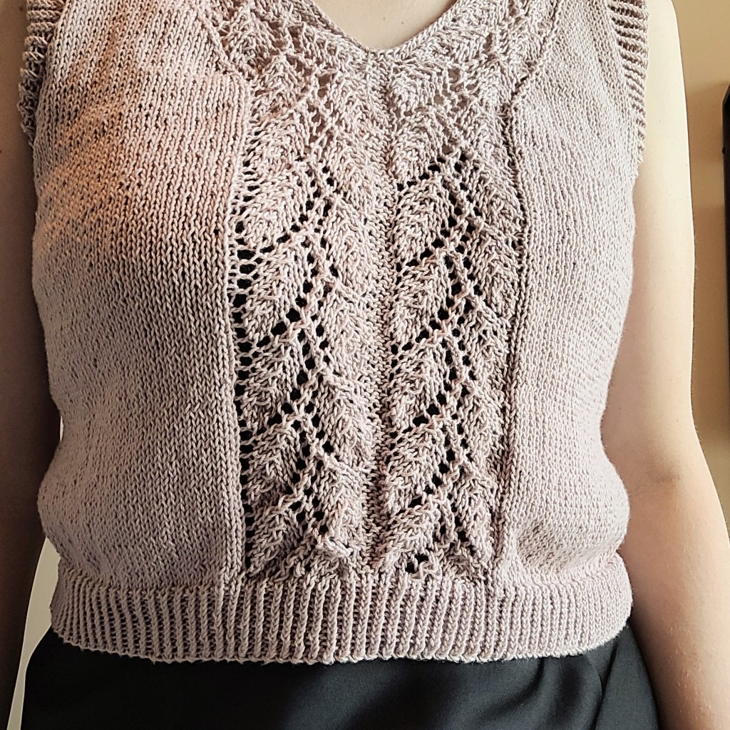 My favourite feature of this pattern is the lace panels on the front. It can be difficult to stay motivated on a knit garment (even one without sleeves), but the lace kept it interesting. Because it’s worked in the round, you aren’t left working rows and rows of stockinette without something to mix it up.