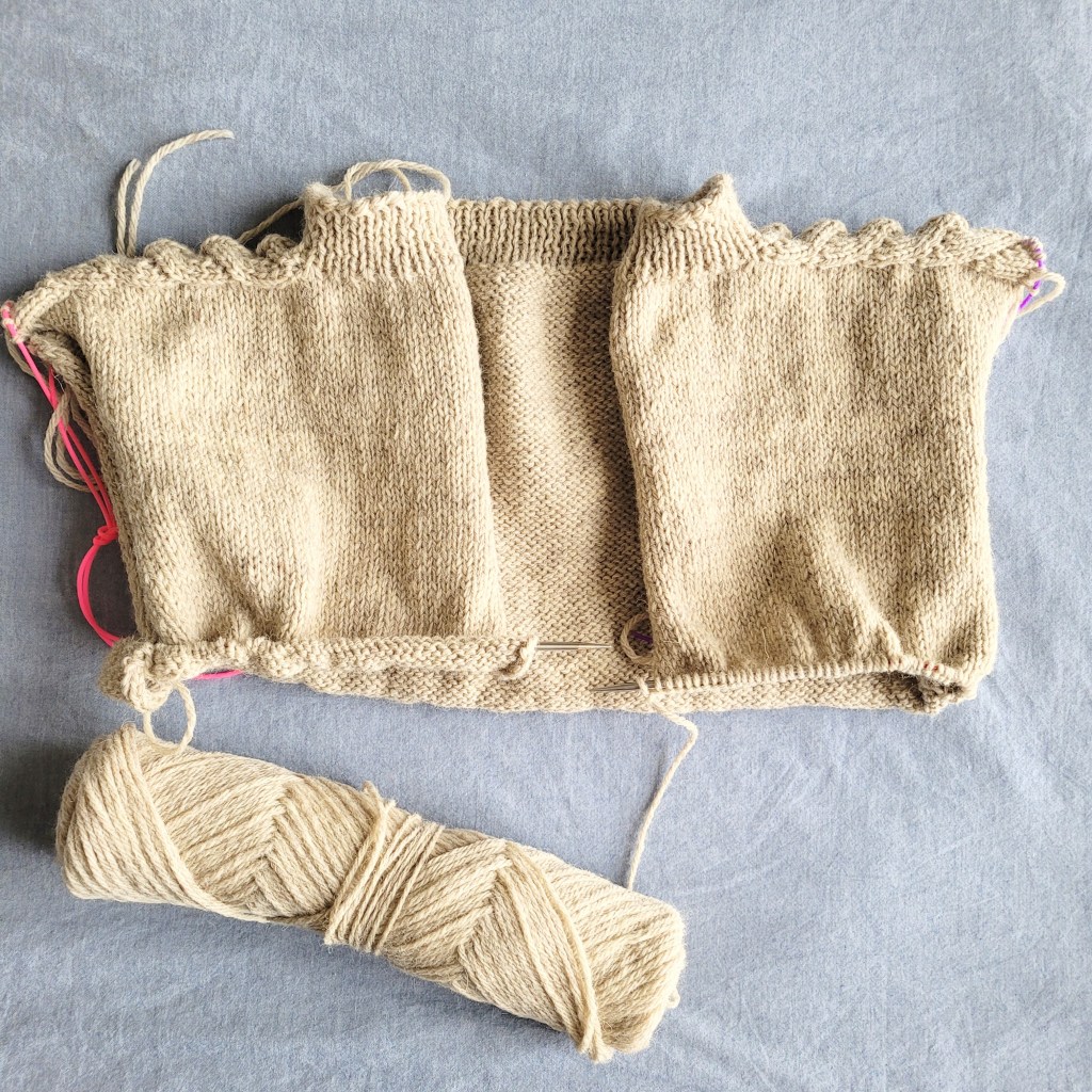 I had three skeins of Lion Brand Fishermen’s wool languishing in my stash for months. I use the word “skeins” loosely as the quantity in each one is massive. I almost squeezed the whole cardigan out of two. Anyways, I really wanted to get them out of my stash, so I did a search on Ravelry for worsted-weight cardigan patterns. I knew I wanted something simple that fit the amount I had on hand, and the Embla Cardigan fit the bill.