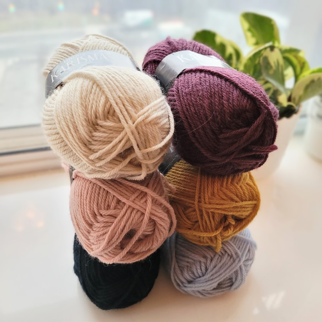 I used a superwash wool for my first version, which yielded a relaxed fabric that blocked nicely. Drops Karisma is an affordable yarn with lots of colour options. As you can see from the photo above, I bought six with the thought that I was going to create a lovely palette. That idea quickly faded when I started incorporating them. It started to look scrappy, and wasn’t the vision I had for this project. I decided to go with three instead.