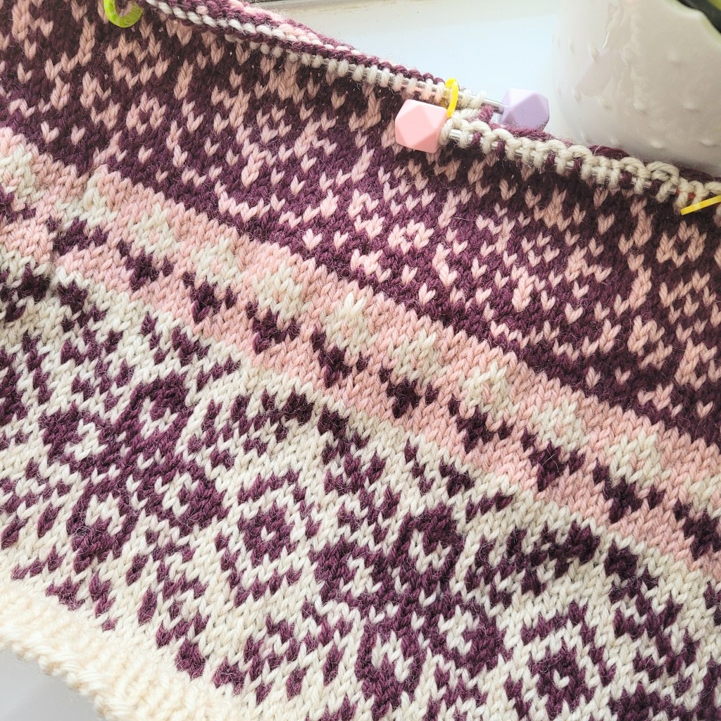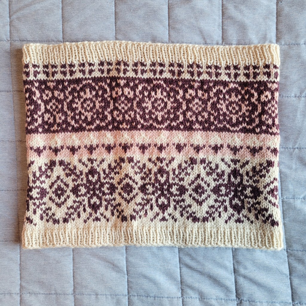 I made this next version as a gift for my mom. Since she has a wool allergy, I used some leftover Loops & Threads Creme Cotton from my stash. I wouldn’t usually use cotton for colourwork, and probably never will again, but I’m still happy with the finished piece.