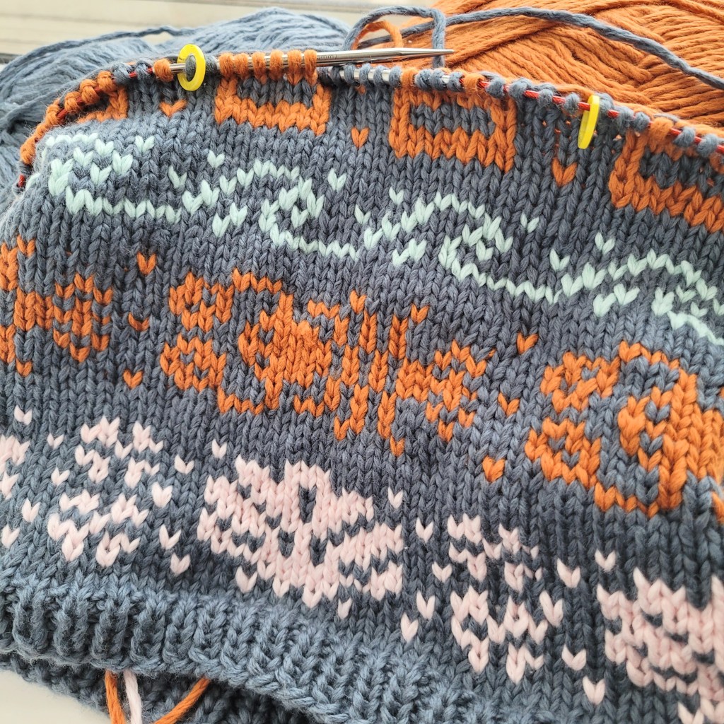 This version really flew off my needles – I had it done in 5 days. I’ll probably give it to my mom a bit early so she can get some use out of it before the weather warms up. I don’t love how the defined stitches of cotton yarn look with colourwork, particularly the lighthouse. I’m a tight knitter and struggled with my tension a bit. Usually this blocks out, but cotton yarn is a little too stable. It also ended up a good inch smaller than my first version, both in length and diameter.